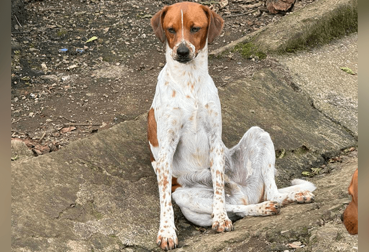 Descripción: es un macho de tamaño mediano, de color blanco con café. Es amigable, bastante travieso y se lleva bien con otros perros.