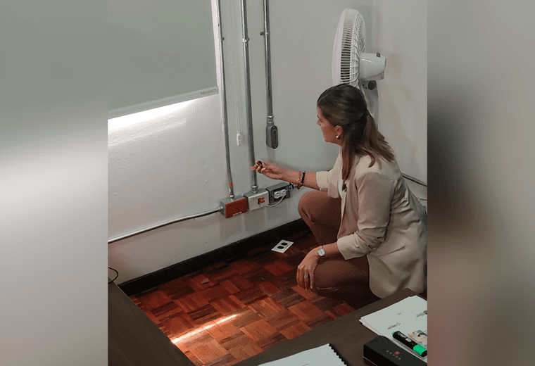 Dentro de un tomacorriente: así asegura Laura Fernández, candidata del Partido Pueblo Soberano (PPSO), que encontraron un micrófono oculto en su oficina.