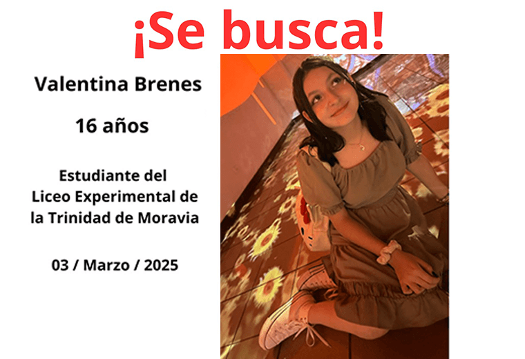 La joven estudia en el Liceo Experimental Bilingüe de La Trinidad de Moravia y de acuerdo con el reporte, iba para el colegio esta mañana, pero nunca entró, desde entonces no se sabe nada de su paradero.