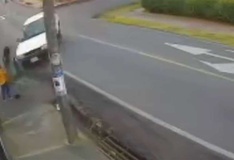 En las imágenes, compartidas en la página de Facebook Cartago Informa, se observa a la mujer caminando de la mano con la menor por la acera. Justo al llegar a la esquina, un vehículo blanco que circulaba a alta velocidad no logra tomar la curva, se sube a la acera y termina impactando contra un poste.