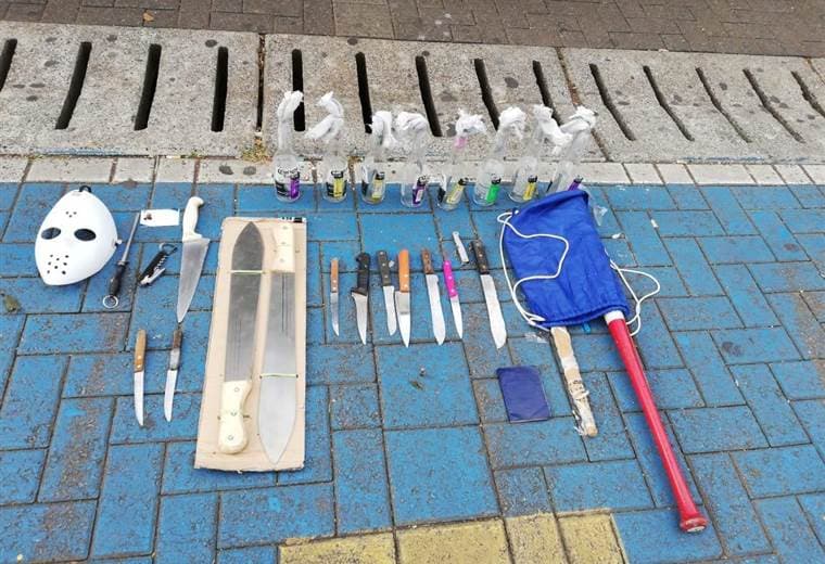 Cuchillos de cocina, espadas, machetes, un bate y bombas molotóv fue parte de lo decomisado por los oficiales de Fuerza Pública.
