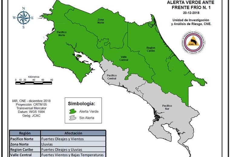 CNE mantiene alerta verde por fuertes vientos y bajas temperaturas provocadas por el frente frío