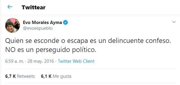 Esto porque el expresidente de Bolivia escribió: “Quien se esconde o escapa es un delincuente confeso. NO es un perseguido político”.