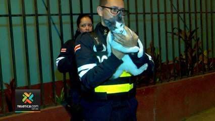 La policía rescató esta madrugada a un gatito que estaba encerrado en una taquería donde había una emergencia por un incendio en Alajuelita.