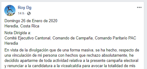 Mediante una publicación en su perfil de Facebook el candidato a la vicealdía de Heredia por el PAC, Roy de la O, presentó su renuncia, luego de que el sábado se diera a conocer una denuncia por acoso sexual en su contra.