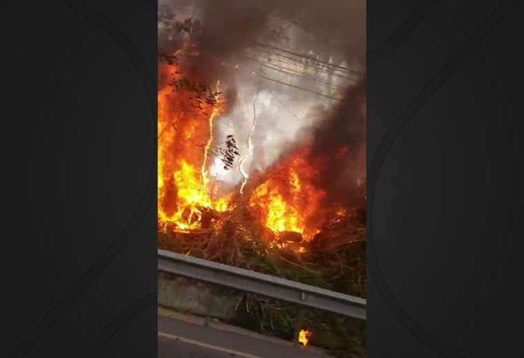 Bomberos intenta apagar un incendio que comenzó en un charral en el precario del Fierro sobra la pista Florencio del Castillo en Cartago, este martes al mediodía.
