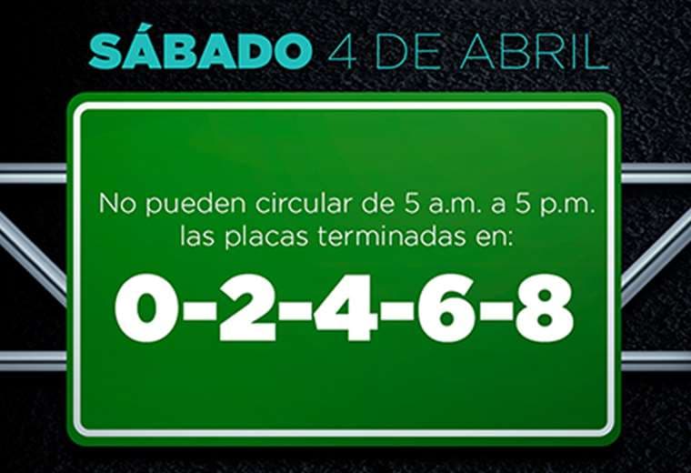 El domingo el turno para poder circular será para las placas terminadas en números pares, y también será por 12 horas, esto a partir de las 5 a.m. y una vez finalizado ese lapso nuevamente regresará la restricción total durante otras 12 horas.