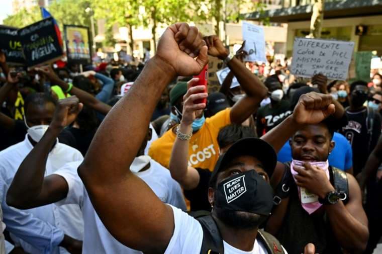 En Barcelona, en el noreste de España, cientos de manifestantes llenaron la plaza de Sant Jaume, donde se encuentra el gobierno regional. Con mascarillas y manteniendo su distancia, levantaron carteles en inglés para denunciar el racismo en España y Europa.