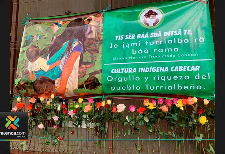 La lona tiene un mensaje en idioma español y cabécar que dice: "Cultura indígena Cabécar. Orgullo y riqueza del pueblo turrialbeño".