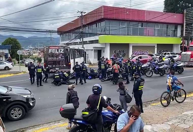 Tres policías resultaron heridos de gravedad y uno más sufrió golpes leves luego de colisionar aparatosamente contra un autobús en el sector de San Francisco de Dos Ríos, San José.