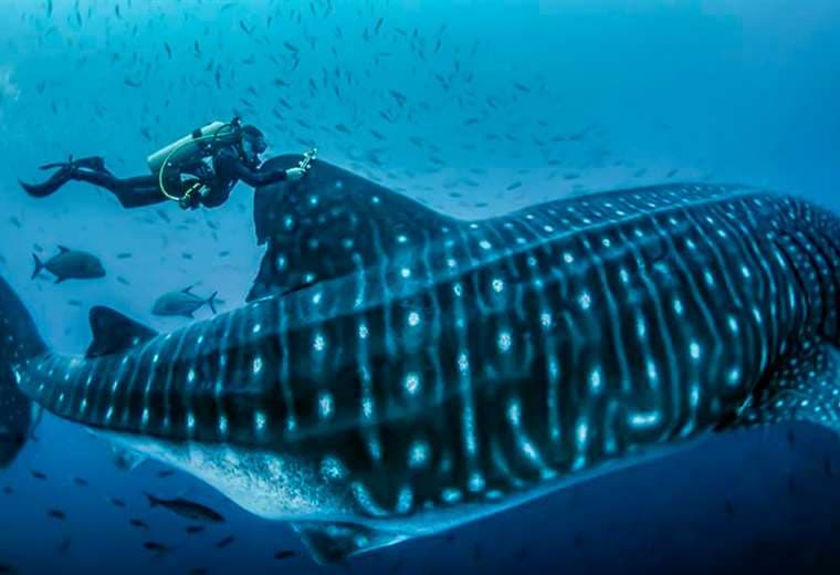 Galápagos registra una de las mayores poblaciones de tiburones ballena, hembras y adultas, del mundo. Usan esta área como zona de rutas, lo que lo hace un destino muy atractivo para los turistas que disfrutan del buceo con estos gigantes del océano.