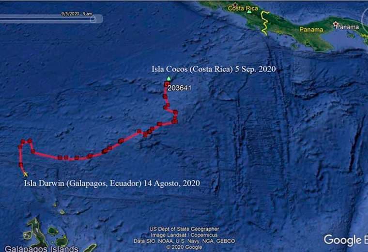 Coco, una hembra adulta de aproximadamente 12 metros de largo, realizó la travesía de 1.100 kilómetros en tres semanas: ella fue marcada a mediados de agosto mientras navegaba al norte del archipiélago ecuatoriano y el 5 de setiembre anterior se reportó su presencia en aguas del parque nacional costarricense.