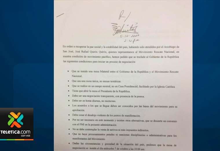 Entre ellas, la número 10, solicita que el gobierno descarte por completo una negociación con el Fondo Monetario Internacional (FMI) en esta administración, la número 11 es que no se venda ningún activo del estado, la 12, que no haya procesos penales para los manifestantes, la 13 que el dialogo empiece hasta el miércoles a las 10 de la mañana y que haya un representante de la iglesia como garante.