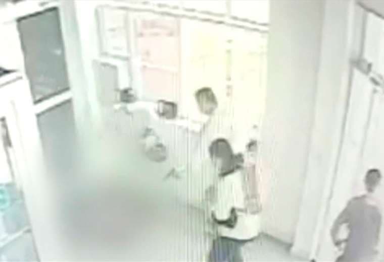 El video de una cámara de seguridad muestra el instante cuando cuatro sujetos ingresan a una agencia bancaria y, sin mediar palabra, disparan contra un oficial.