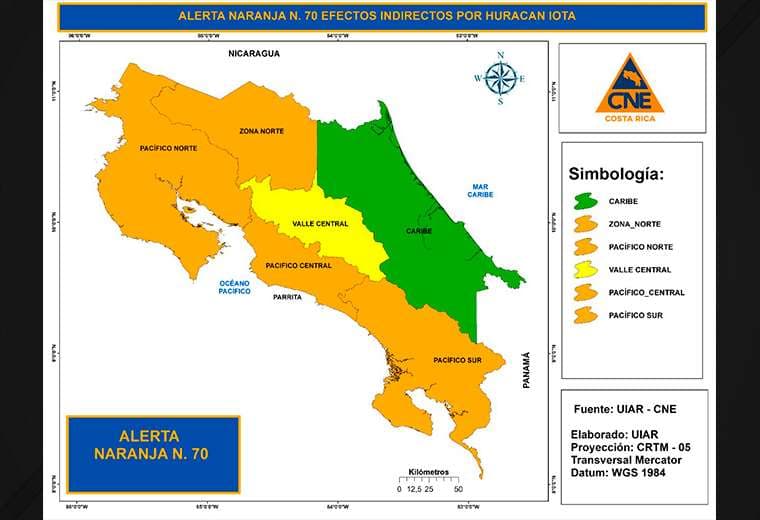 Las lluvias por el impacto del huracán Iota se sentirán en Costa Rica a partir de la noche de este lunes, conforme el evento se aproxime a Centroamérica; por esa razón, la Comisión Nacional de Emergencias (CNE) actualizó las alertas para varias regiones del país y pide mayor vigilancia a quienes habiten en zonas con riesgo de inundaciones.
