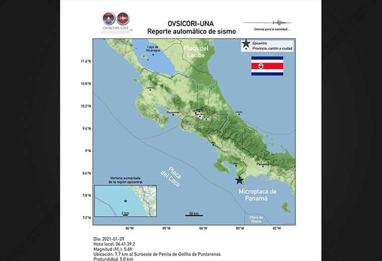 Según el reporte del Observatorio Vulcanológico y Sismológico de Costa Rica, tuvo una profundidad de 5 kilómetros y su epicentro se localizó 7.7 km al suroeste de Penita de Golfito de Puntarenas.