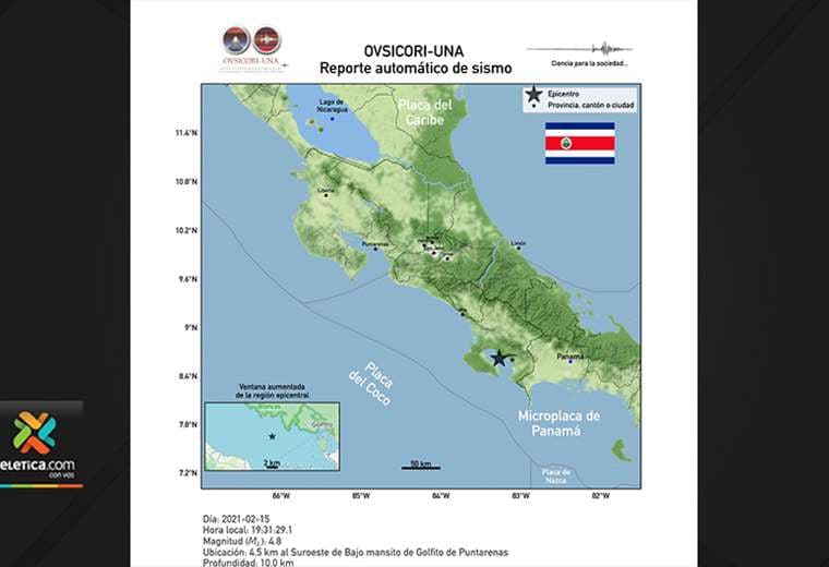 De acuerdo con el reporte emitido por el OVSICORI, ocurrió a las 7:31 de la noche de este lunes y tuvo una profundidad de 10 kilómetros.