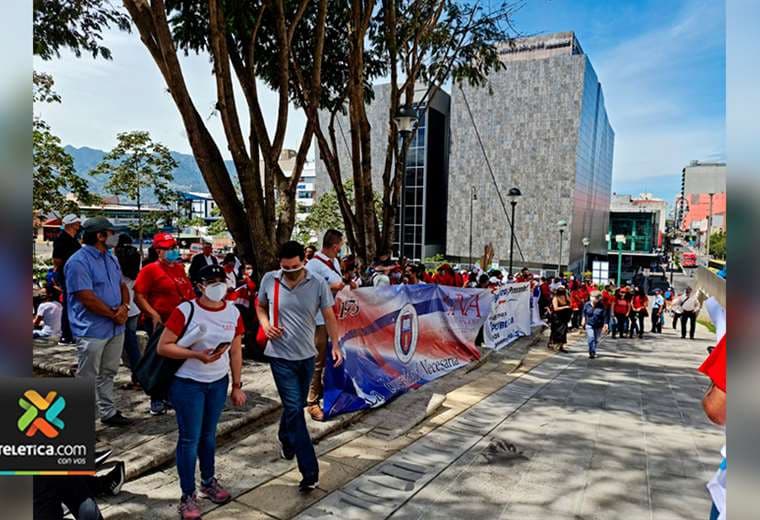 Vestidos de blanco, azul y rojo, decenas de universitarios y docentes se manifiestan, la mañana de este jueves, frente al edificio de la Asamblea Legislativa en su lucha contra el proyecto de empleo público.