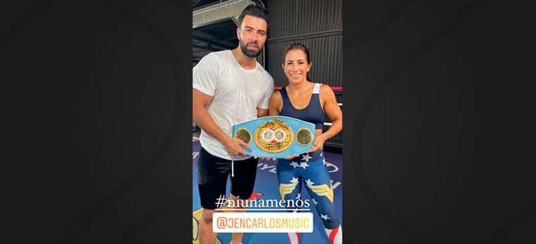 "Hoy fui la envidia de muchas chicas, @jencarlosmusic me retó y si nos subimos al ring, no les puedo decir el resultado pero la verdad lo trate bien porque mi mamá me advirtió cuidado me le pega! Gracias Jen por apoyar nuestro mensaje #niunamenos", describe la publicación en el Instagram de la boxeadora nacional.