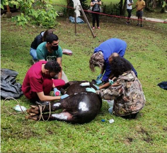 De acuerdo con Brenes, en una colaboración entre Toucan Rescue Ranch, la Oficina Regional de Heredia del SINAC y vecinos de la zona, lograron inmovilizar a la danta para curar sus heridas y devolverla al bosque.