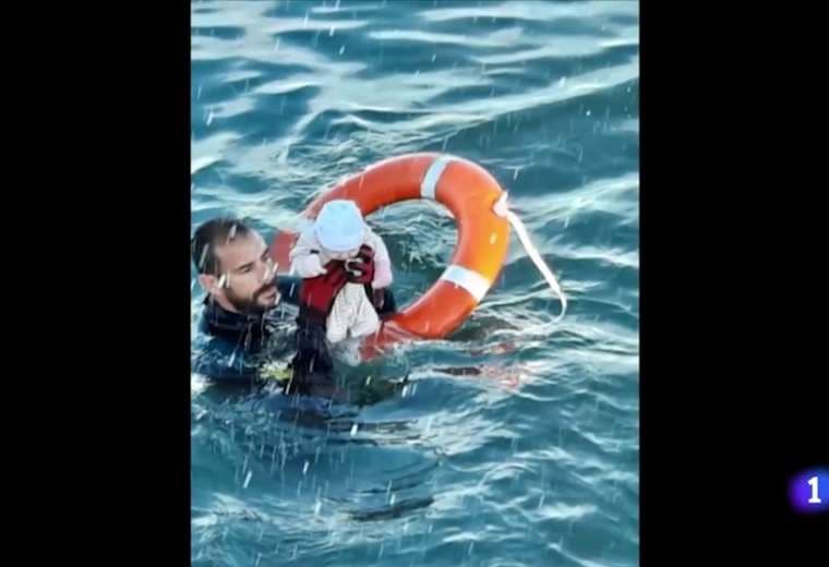 En España, el drama de la crisis migratoria muestra cómo un guardia civil rescató del mar a un bebé que llevaba su madre en la espalda mientras nadaba desde Marruecos.