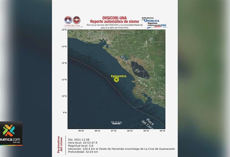 El epicentro se registró 120 kilómetros al oeste de Hacienda Murciélago en La Cruz de Guanacaste.