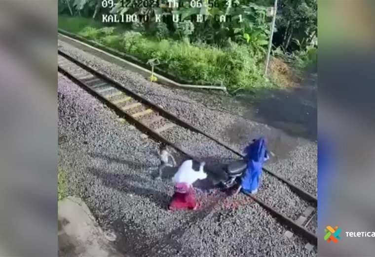 Como se aprecia en el video, la mujer trata de cruzar la vía férrea con su moto y una hija y un hijo a bordo, sin embargo, la motocicleta se queda atascada en las vías, de inmediato se bajan todos, el niño pequeño corre a resguardarse y la madre se queda con la hija mayor tratando de liberar la moto.