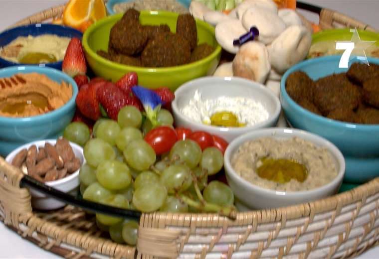 Todo eso acompañado de frutas y vegetales frescos, pan pita, y frutos secos.