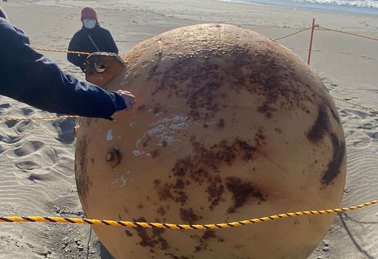 La televisión pública japonesa NHK mostró imágenes de dos funcionarios en la playa de Enshuhama observando la esfera de metal oxidada, cuyo diámetro aproximado es de 1,5 metros.