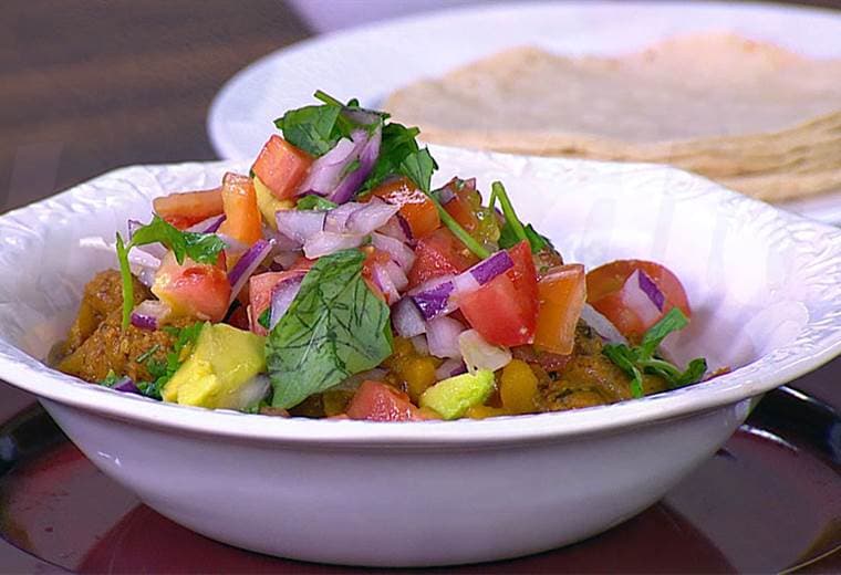 Aparte en una sartén colocar el chorizo cortado en trozos pequeños y dejar que se cocine y que quede dorado. Una vez que este dorado, agregar el achiote, la cebolla el ajo y el chile dulce y saltear. Dejar que se sofrían bien los olores. Agregar las papas, el caldo de pollo y el tomate. Dejar que llegue a ebullición y se reduzca un poco el líquido. Finalmente agregar el apio y el culantro. Dejar unos 5 minutos a fuego bajo y servir.