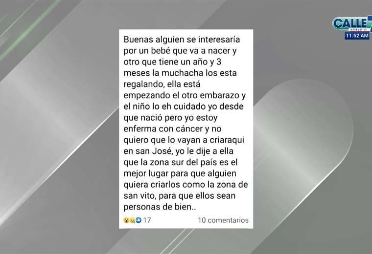 “Buenas alguien se interesaría por un bebé que va a nacer y otro que tiene un año y 3 meses. La muchacha los está regalando, ella está empezando el otro embarazo y el niño lo he cuidado yo desde que nació, pero yo estoy enferma de cáncer y no quiero que lo vayan a criar aquí en San José, yo le dije a ella que en la zona sur del país es el mejor lugar para que alguien quiera criarlos, como en la zona de San Vito, para que ellos sean personas de bien”, leía el post.