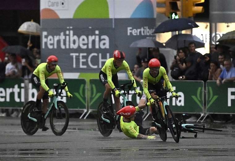 Bajo la lluvia y varias caídas, el equipo DSM-Firmenich ganó este sábado la primera etapa de la Vuelta a España, una contrarreloj por equipo en las calles de Barcelona.