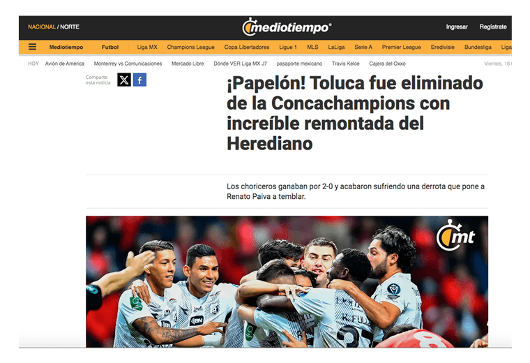 “¡Papelón! Toluca fue eliminado de la Concachampions con increíble remontada del Herediano”, fue el título con el que abrió su portal web Mediotiempo.