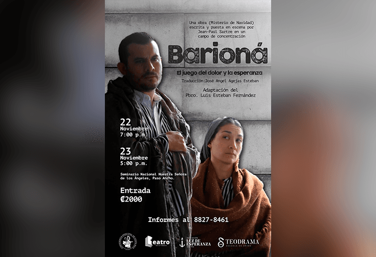 El Teatro de La Palabra, en conjunto con la Comisión de Educación y Cultura de la Conferencia Episcopal de Costa Rica (CECOR), presentará la obra Barioná, el juego del dolor y la esperanza, una pieza escrita por el filósofo francés Jean-Paul Sartre durante la Segunda Guerra Mundial y que llega al país con un mensaje profundamente actual: la esperanza que renace incluso en medio de la adversidad.