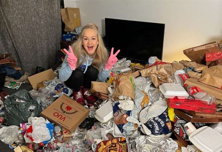 Auri, una finlandesa de 28 años, muestra el interior de un departamento lleno de basura ante la cámara. En medio de los desechos, agarra un trozo de pizza dudoso y lleno de bichos.