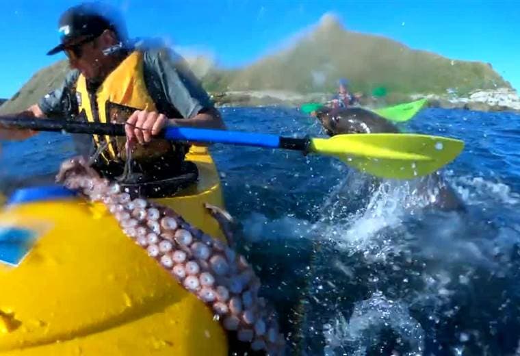 Un león marino golpea a kayakista con un pulpo y se vuelve viral en redes sociales