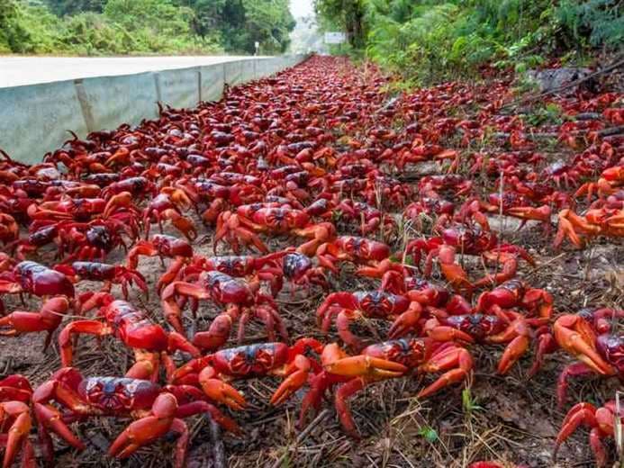Un hecho poco común tiñe de rojo las calles de la Isla de Navidad en Australia cuando millones de cangrejos rojo fuego realizan su migración anual.