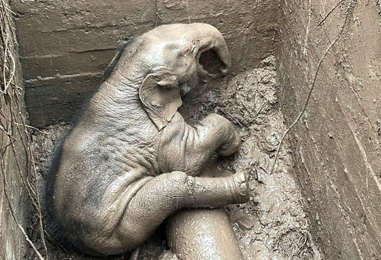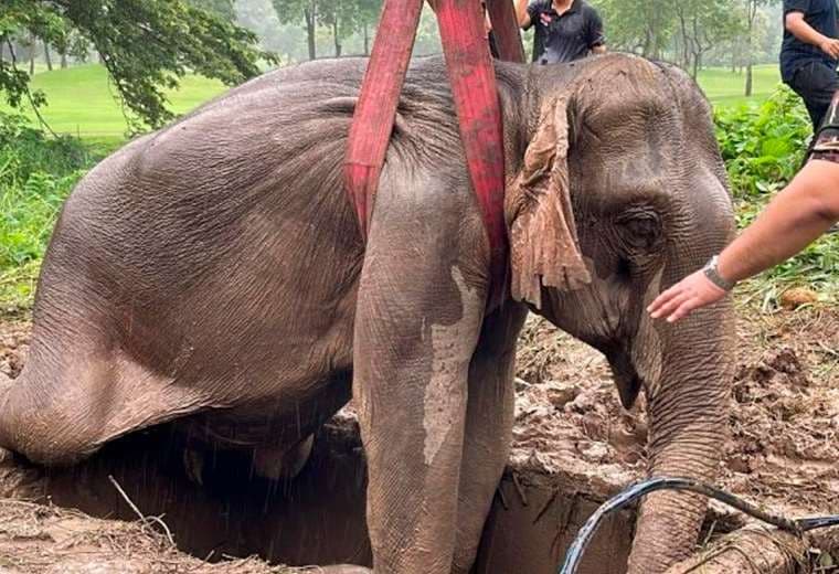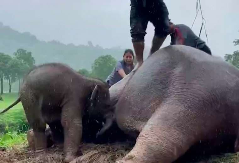 Una madre elefante sufrió un desmayo tras un intento desesperado por proteger a su cría que había caído en un desagüe en Tailandia.