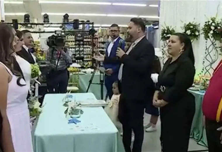 Una escena tanto inusual como romántica: tres parejas se dieron el “sí, acepto” en medio de un supermercado, en el corazón de la capital costarricense, en vísperas del Día del Amor y la Amistad.
