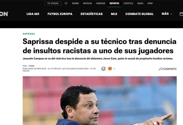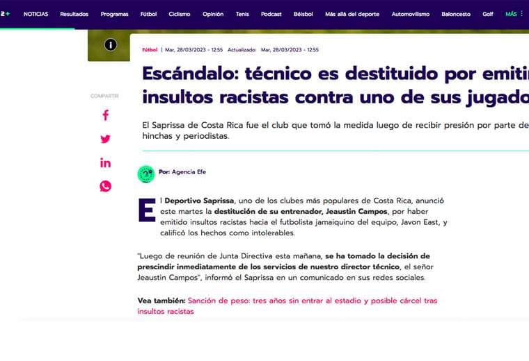 Otros medios que también replicaron la noticia fueron RPC de Panamá, que tituló “Saprissa destituye al entrenador Jeaustin Campos por insultos racistas” y Antena2 de Colombia: “Escándalo: técnico es destituido por emitir insultos racistas contra uno de sus jugadores”.