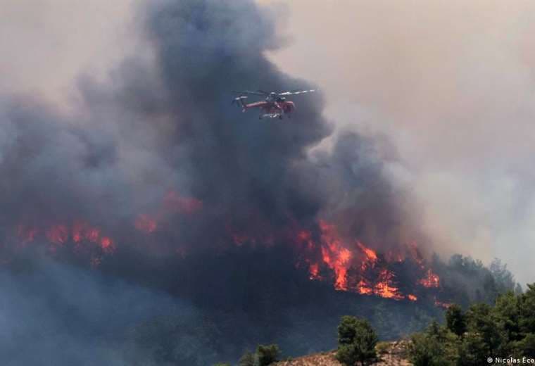 Los incendios forestales en Grecia arrasan parte de la isla de Rodas por séptimo día consecutivo, lo que obligó a las autoridades a improvisar en el aeropuerto del lugar un campamento para turistas.