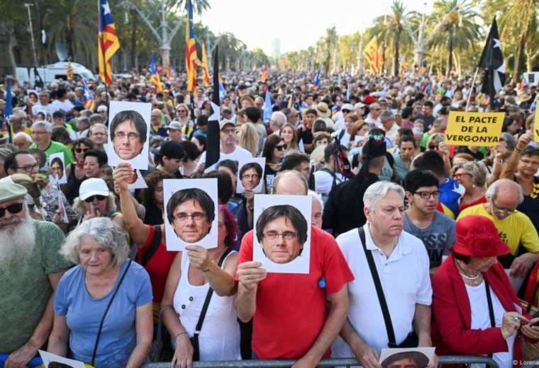 Puigdemont llegó acompañado por dirigentes de su partido independentista Junts per Catalunya (JxC) y se abrió paso entre sus seguidores al grito de "Independencia" hasta un escenario instalado frente al conocido Arco del Triunfo de Barcelona, desde donde se dirigió a los asistentes.
