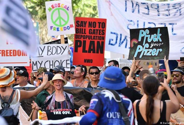 En el centro de la ciudad de Melbourne, en el estado de Victoria, más de mil personas se concentraron de manera pacífica con banderas australianas y pancartas en contra de la vacunación y las restricciones por COVID-19, mientras gritaban lemas como "mi cuerpo, mi decisión".