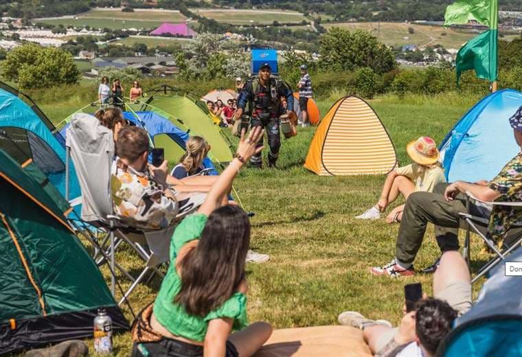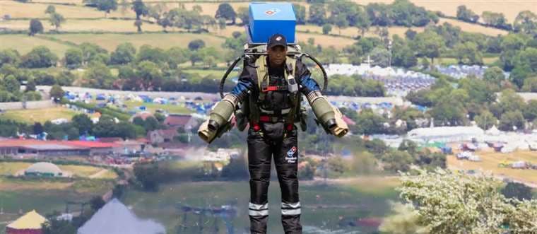 La cadena de pizzas Domino's probó su primera entrega en jetpack (mochila propulsora) a los asistentes del Festival de Glastonbury, que se llevó a cabo del 21 al 25 de junio en el Reino Unido, previo a la presentación del legendario Elton John.
