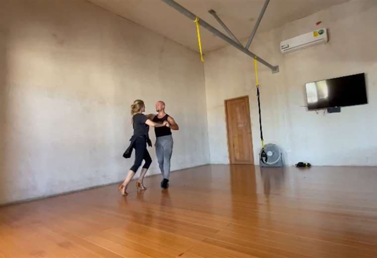 “Acabo de sudar como cinco kilos, no sé si se mide en kilos, pero yo creo que debo estar pesando unos cinco kilos menos”, dijo la actriz tras ensayar con su bailarín.