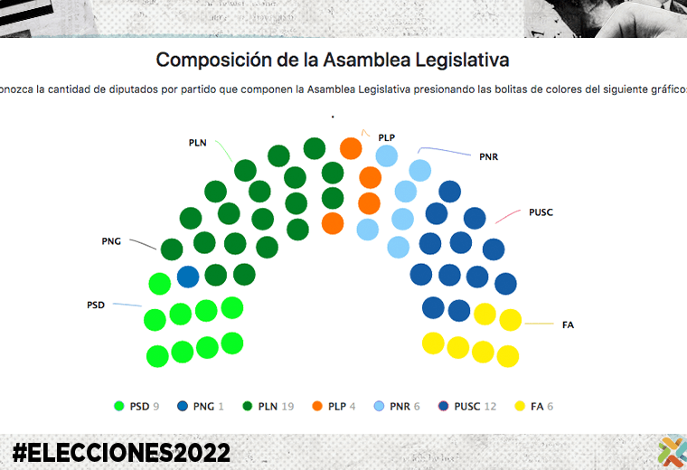 Liberación Nacional (PLN), Unidad Social Cristiana (PUSC) y Partido Progreso Social Democrático serían las fracciones más grandes. Así lo muestran las proyecciones de Telenoticias, que toman como referencia los datos del Tribunal Supremo de Elecciones (TSE), con un 88,20% de las mesas escrutadas.