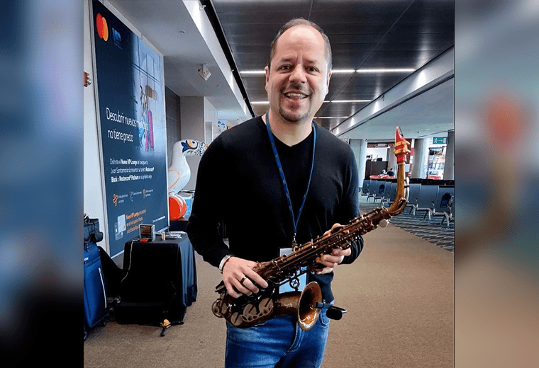 Se trata de Geovanny Escalante, de 48 años, quien hoy, 25 años después, sigue tocando el saxofón, pero ahora lo hace en el Aeropuerto Juan Santamaría, donde trabaja cuando no está ocupado administrando su propio emprendimiento de café.