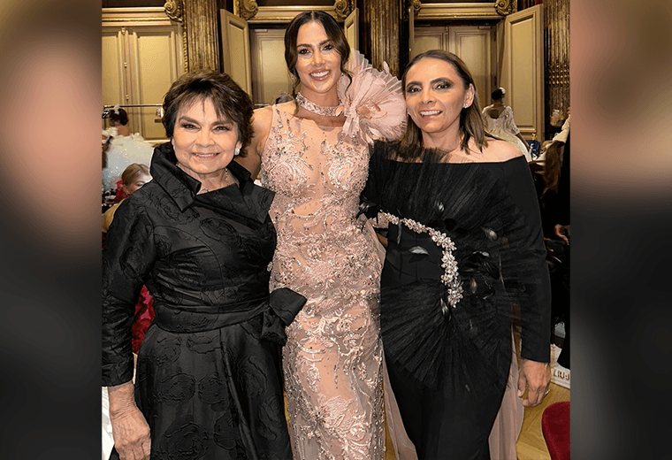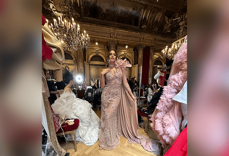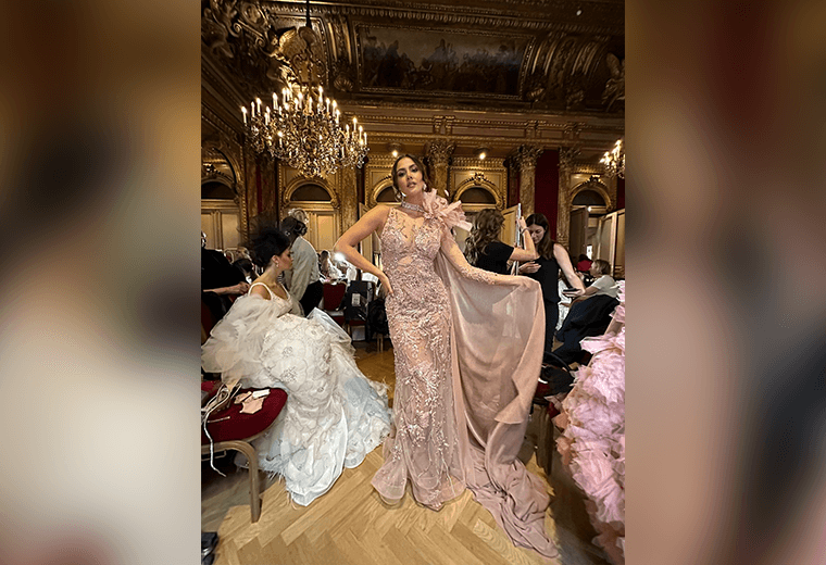 Karina Ramos deslumbró en la pasarela del Paris Fashion Week luciendo un espectacular traje de noche diseñado por la diseñadora mexicana Teté Rosado.