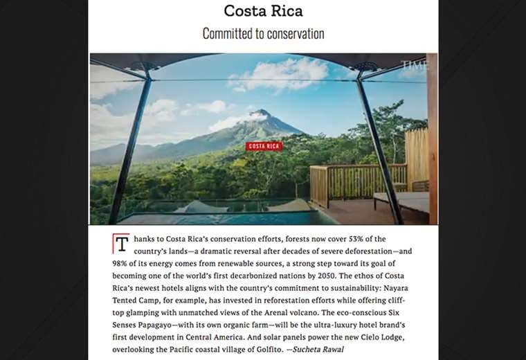 "Gracias a los esfuerzos de conservación de Costa Rica, los bosques ahora cubren el 53% de las tierras del país, un cambio dramático después de décadas de severa deforestación, y el 98% de su energía proviene de fuentes renovables, un gran paso hacia su objetivo de convertirse en una de las primeras naciones descarbonizadas para 2050", se lee en la publicación de TIME.