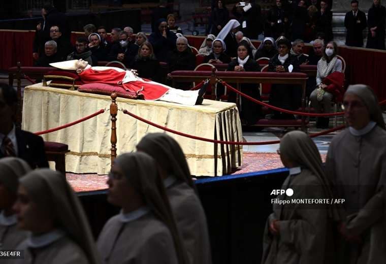 Decenas de miles de fieles desfilaron este lunes ante el cuerpo de Benedicto XVI, en la capilla ardiente instalada en la basílica de San Pedro, en el Vaticano, para despedir al pontífice emérito, fallecido el sábado a los 95 años.